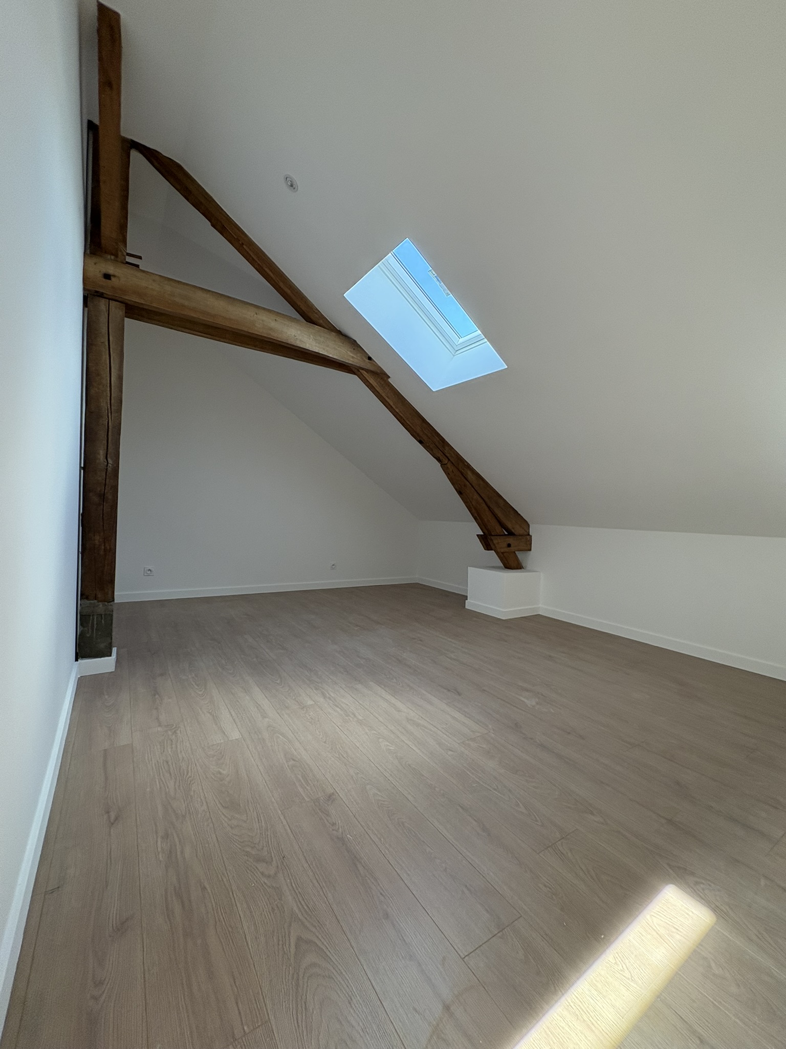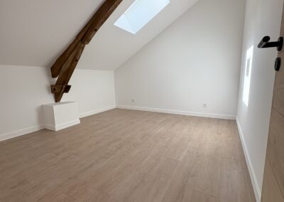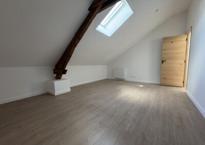 A l’étage, deux chambres mansardées et une salle de douche avec toilette.